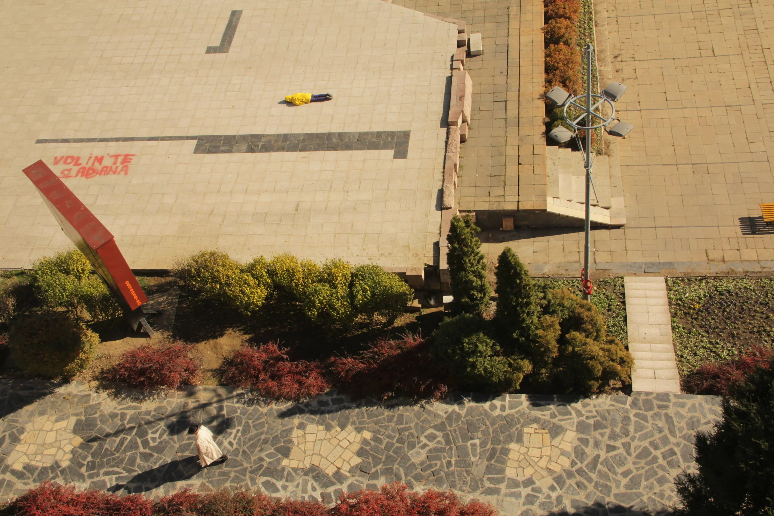 U sklopu programa Okupljeni na Trgu partizana u Užicu, koji povodom obilježavanja 70 godina od pobjede nad fašizmom kurira beogradski redatelj Bojan Đorđev, izvest ću šestosatnu intervenciju u javnom prostoru. Ova jednostavna, tjelesno-vizualna intervencija u prostor trga mišljena je kao subverzivan čin otpora, refleksije i odbijanja prisilne normalizacije društvenih odnosa.